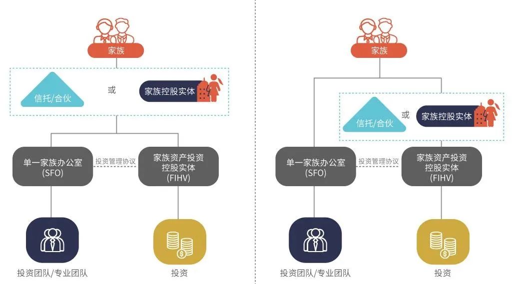 一般來說,家族可以直接或間接持有家辦,并通過家族信托和合伙制的穿透型或家族實(shí)質(zhì)控股公司兩種架構(gòu)持有FIHV。FIHV通過簽訂投資管理協(xié)議委托家辦提供服務(wù):