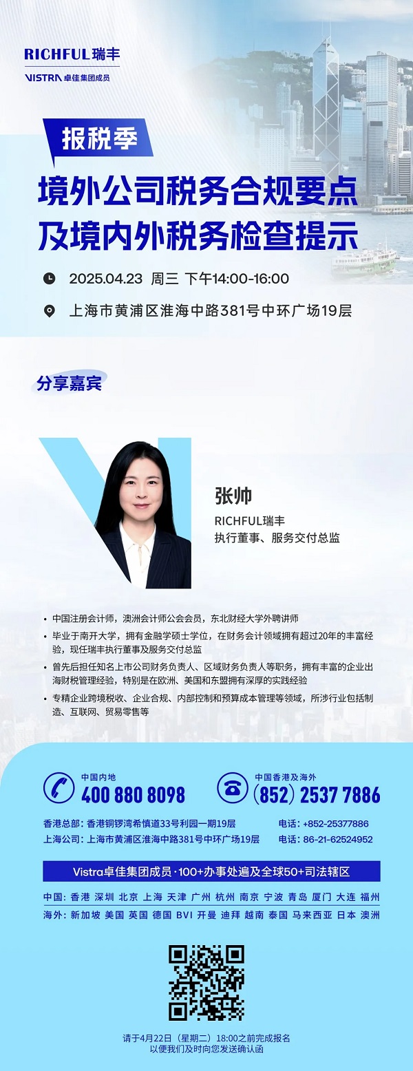 為幫助您更深入理解境外公司稅務(wù)合規(guī)要點(diǎn),精準(zhǔn)把握境內(nèi)外稅務(wù)檢查關(guān)鍵,我們誠(chéng)摯邀請(qǐng)您參與以下專業(yè)活動(dòng)。在活動(dòng)中,您將獲得行業(yè)前沿的稅務(wù)知識(shí)與實(shí)操技巧,助力企業(yè)從容應(yīng)對(duì)復(fù)雜多變的稅務(wù)環(huán)境。